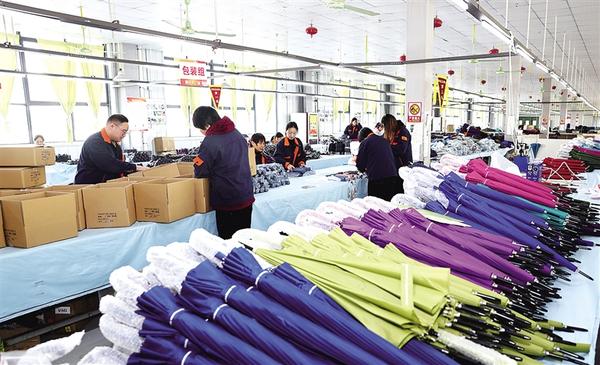 在兆亿伞业生产车间,近200名员工在2条生产线上忙碌,加紧赶制订单。该公司总经理张平表示:“去年,公司年产能约250万支。当前,我们正冲刺年产能300万支的目标。”