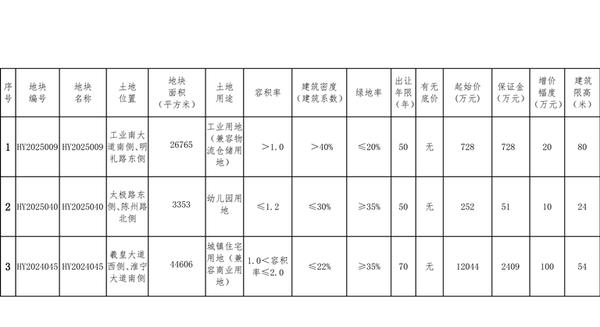 拍卖报价时间:2026年1月8日9时(HY2025009地块)。 2026年1月8日9时10分(HY2025040地块)。 2026年1月8日9时20分(HY2024045地块)。拍卖网址:周口市公共资源交易中心网站(网址:http://221.14.138.68/)。