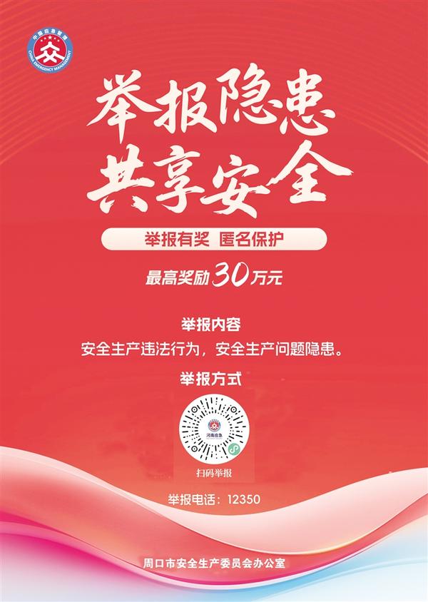 周口市安全生产委员会办公室以举报电话、扫码举报等方式,受理群众举报安全生产非法违法行为线索。一经查实,我们将依据《河南省安全生产领域举报奖励实施办法》相关规定,对举报人予以奖励,最高奖励金额30万元。我们将对举报人个人信息进行严格保密,依法保护举报人的合法权益。