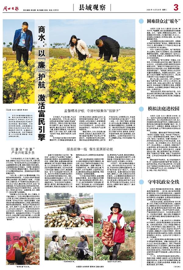 夕阳西下,落日余晖映照着商水大地。联丰农机农民专业合作社厂房里,打包完毕的红薯制品整装待发,将把“商水味道”送往千家万户。大路李村的菊田里,金黄的菊花在风中轻轻摇曳,菊香沁人心脾,仿佛在诉说丰收的喜悦。从红薯飘香的姚集镇务台村到菊香四溢的郝岗镇大路李村,商水县纪委监委以精准监督护航产业发展,用严明纪律守护民生福祉,为乡村振兴注入源源不断的“廉动力”,激活发展新引擎。
