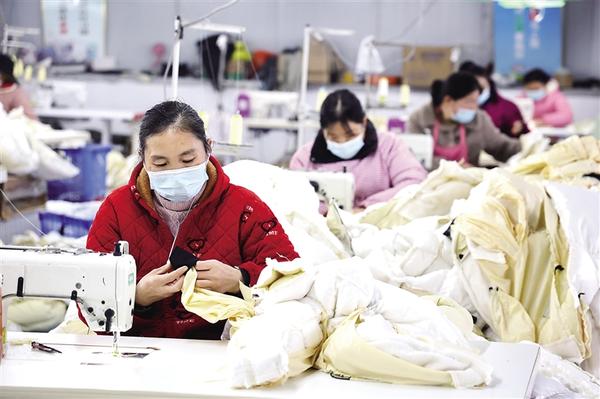 近年来,淮阳区四通镇中营子村以党建为核心引擎,筑牢基层战斗堡垒,牵头建起现代农业服务合作社、种植合作社等,走出“党组织搭台、企业唱戏、群众受益”的强村路径。图为村民在村办服装厂工作。 记者 刘俊涛 摄