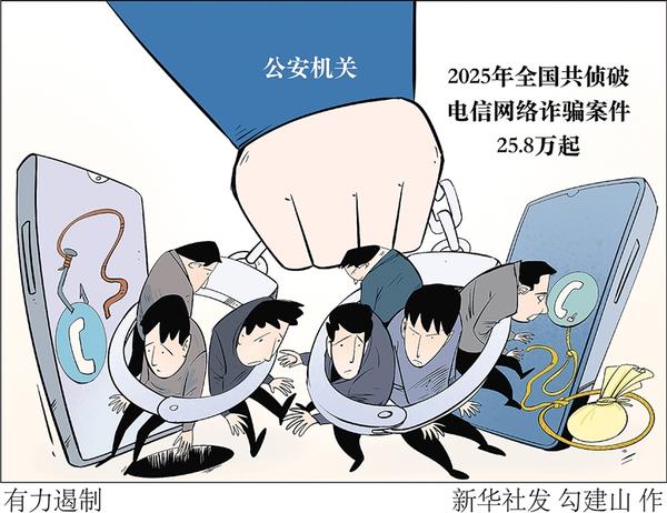记者1月8日从公安部新闻发布会获悉,2025年,全国公安机关依法严厉打击电信网络诈骗犯罪,有力遏制了犯罪高发势头,共侦破有关案件25.8万起。 新华社发 勾建山 作