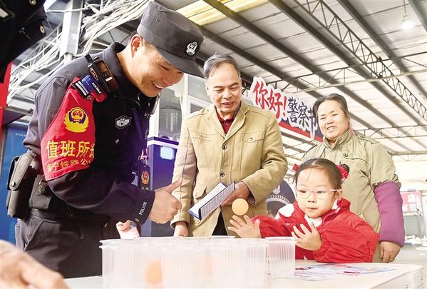 1月9日,在南宁站举行的警营开放活动中,小朋友在玩游戏。