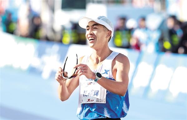 1月11日 ,2026厦门马拉松赛开赛。我国选手李美珍、杨绍辉分别获得中国籍女子组第一名和中国籍男子组第一名。左图为李美珍冲过终点线后庆祝。右图为杨绍辉在夺得小组第一名后庆祝。