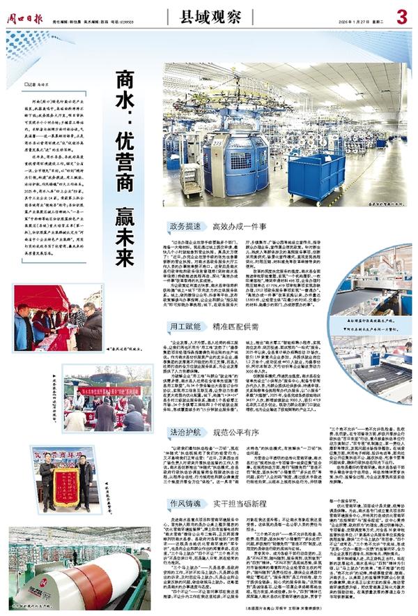 河南(周口)绿色印染示范产业园里,机器轰鸣中,高端面料源源不断下线;政务服务大厅里,项目审批可实现半个小时办结;乡镇零工驿站内,求职者与招聘方面对面洽谈,气氛温馨……这一幕幕鲜活场景,正是商水县以营商环境之“优”促经济高质量发展之“进” 的生动写照。