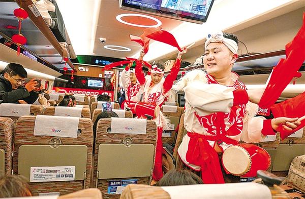 1月26日,青年志愿者在遵义开往延安方向的G3360次列车上给旅客表演节目。