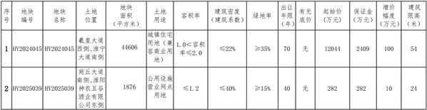 1. HY2025045宗地土地用途为城镇住宅用地(兼容商业用地),兼容商业设施建筑面积不宜超过地上总建筑面积的10%,商业用地出让年限为40年。配建配套幼儿园(6个班)、托儿所(50个托位),建成后无偿移交给政府。按照每百户不低于30平方米标准配套建设居家养老服务设施,单处用房面积不得少于300平方米,与住宅同步规划、同步建设、同步验收。