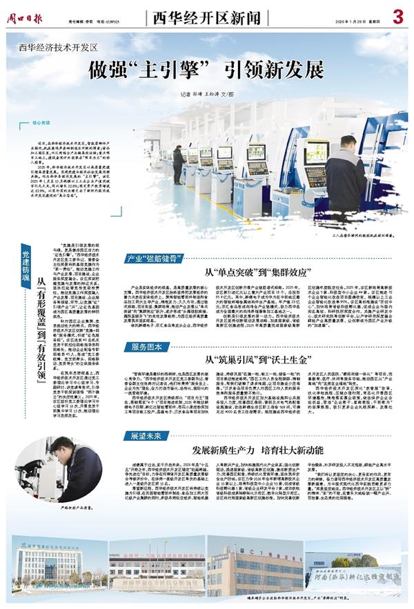 展望新征程,西华经济技术开发区将持续以党建为引领,在巩固智能零部件制造、食品加工两大百亿级产业集群的同时,积极布局低空经济、智能机器人等新兴产业,加快构建现代化产业体系;强化创新驱动,提速国家级、省级高新区创建,激活新质生产力;完善园区配套,持续优化营商环境,坚决筑牢安全生产防线。该区力争2026年全年新增高新技术企业10家以上,培育科技型中小企业50家,创成省级科技孵化器1家、省级企业研发平台2家,成功获批省级科技成果转移转化示范区、数字化转型示范区。该区将对照国家级高新区创建标准,加快完善创新平台载体,补齐研发投入不足短板,赋能产业高水平发展。