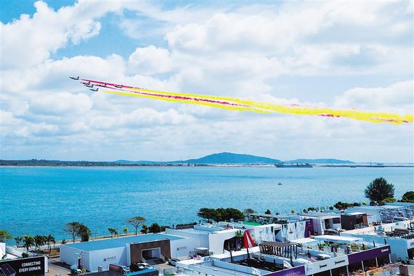 1月30日上午,中国空军八一飞行表演队在新加坡樟宜机场海面上空展开空中特技动作飞行。