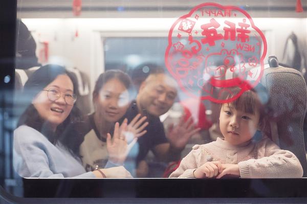 2月2日,在上海虹桥火车站,G14列车乘客在发车前挥手告别。
