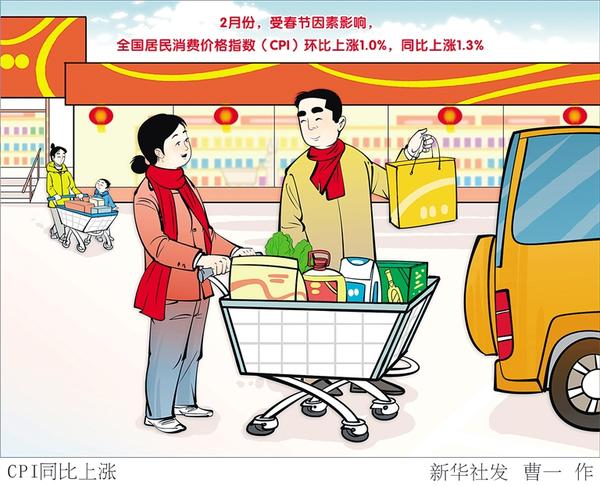 国家统计局3月9日发布数据显示,2月份,受春节因素影响,全国居民消费价格指数(CPI)环比上涨1.0%,同比上涨1.3%,扣除食品和能源价格的核心CPI同比上涨1.8%。 新华社发 曹一 作