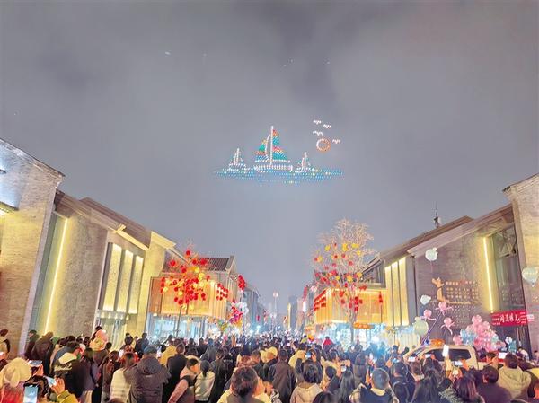 3月3日晚,500架无人机缓缓升空,瞬间点亮夜幕。点点星光迅速集结、有序变换,引得现场观众阵阵欢呼。光影流转间,无人机编队接连变换造型,尽显周口特色与文化底蕴:龙马造型凌空呈现,寓意吉祥如意,象征马到成功;“三鱼同首”图案缓缓浮现——这一源自关帝庙旗杆底座的经典纹饰,寄托着周口人民对和谐美满的祈愿。当“万家灯火侔江浦,千帆云集似汉皋”的经典诗句闪耀夜空时,现场掌声雷动,千年漕运文化的厚重底蕴扑面而来。