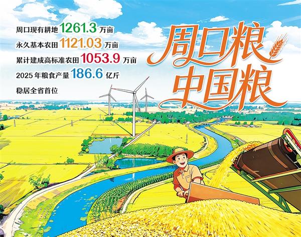 作为河南第一产粮大市,周口现有耕地 1261.3 万亩,永久基本农田 1121.03 万亩,已累计建成高标准农田 1053.9 万亩。全国、全省高标准农田建设现场会先后在此召开,探索形成的建设标准化、装备现代化、应用智能化、经营规模化、管护规范化 “五化” 模式,在全省乃至全国推广。2025 年,周口克服春夏连旱、秋收连阴雨等恶劣天气,粮食产量达 186.6 亿斤,稳居全省首位。记者 付永奇 周彦 作