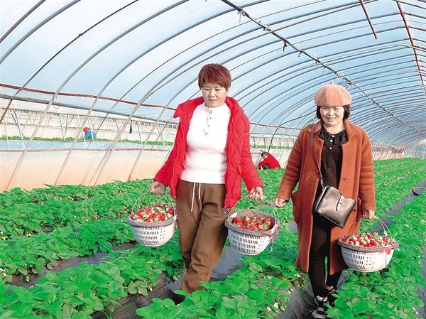 周营镇东李营村裕和草莓采摘园内,10余座标准化大棚整齐排列,红、白、粉各色草莓缀满藤蔓,清甜果香吸引游客络绎不绝。采摘园负责人李莉笑着介绍:“采摘旺季,每天可以收入3000元左右。”