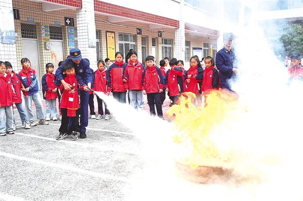3月30日,在四川省内江市东兴区郭北镇中心学校,东兴区消防救援局工作人员指导学生使用灭火器。
