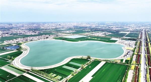 近日,记者利用无人机俯瞰引江济淮郸城县配套工程蓄水库,碧水如琉璃,形若“宝葫芦”。