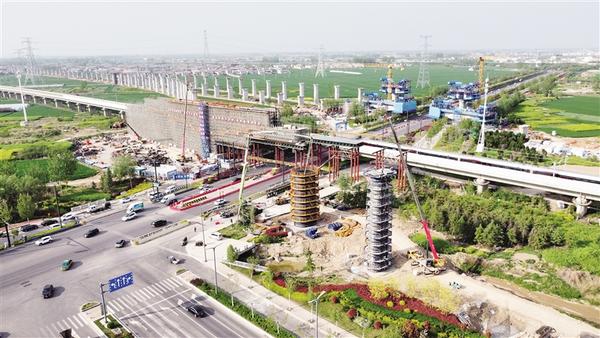 4月9日,记者在平漯周高铁跨太清路桥建设现场看到,机械运转,塔吊高耸,工人正在浇筑大型桥梁结构,一派热火朝天的施工景象。记者 刘俊涛 摄