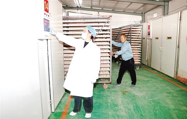 在汲水镇新鑫种鸡孵化车间内,自动化设备精准控温,一枚枚种蛋有序孵化,钢化蛋生产线高效作业,产品供不应求。