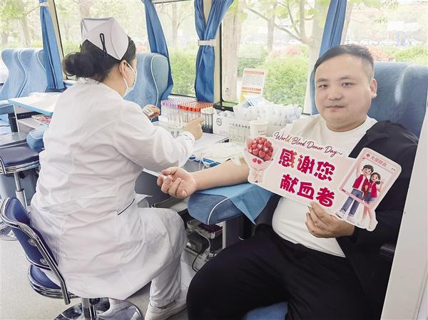 4月11日,河南科技职业大学联合周口市中心血站组织开展无偿献血活动。图为活动现场。