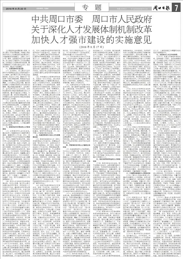 中共周口市委 周口市人民政府 关于深化人才发展体制机制改革 加快人才强市建设的实施意见