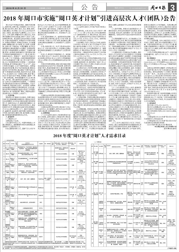 2018年周口市实施“周口英才计划”引进高层次人才(团队)公告