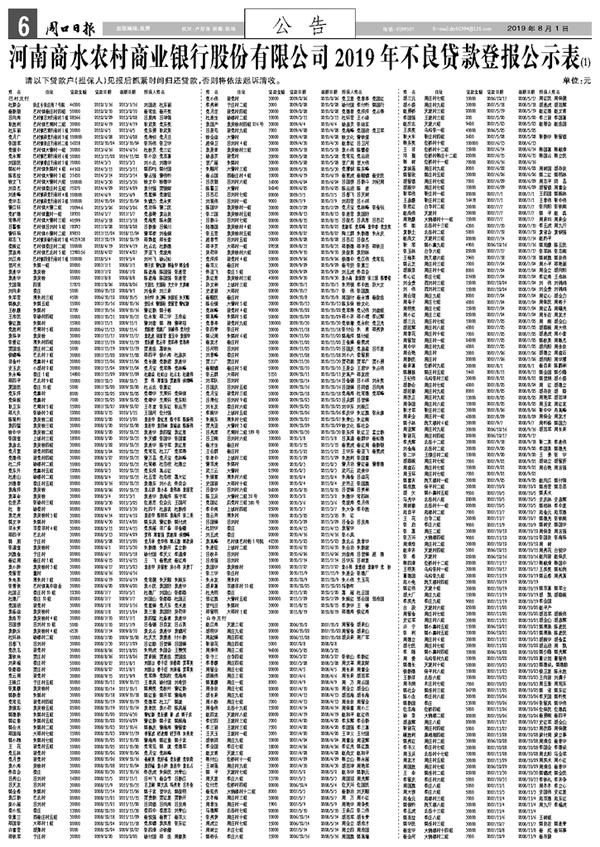 河南商水农村商业银行股份有限公司2019年不良贷款登报公示表(1)