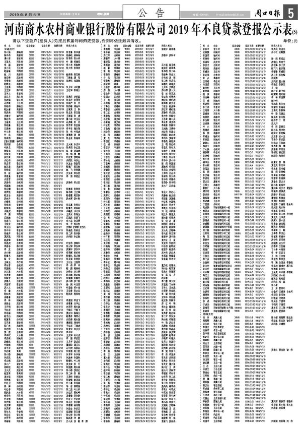 河南商水农村商业银行股份有限公司2019年不良贷款登报公示表(5)