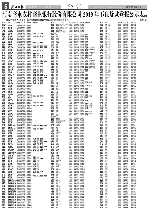 河南商水农村商业银行股份有限公司2019年不良贷款登报公示表(6)