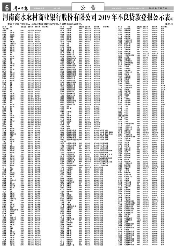 河南商水农村商业银行股份有限公司2019年不良贷款登报公示表(8)