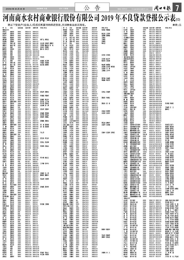河南商水农村商业银行股份有限公司2019年不良贷款登报公示表(12)