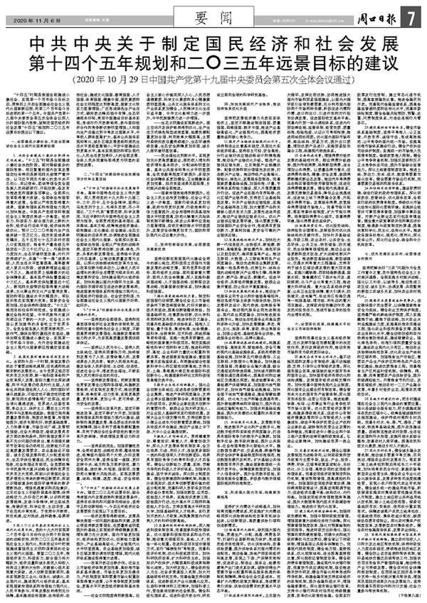 中共中央关于制定国民经济和社会发展第十四个五年规划和二〇三五年远景目标的建议