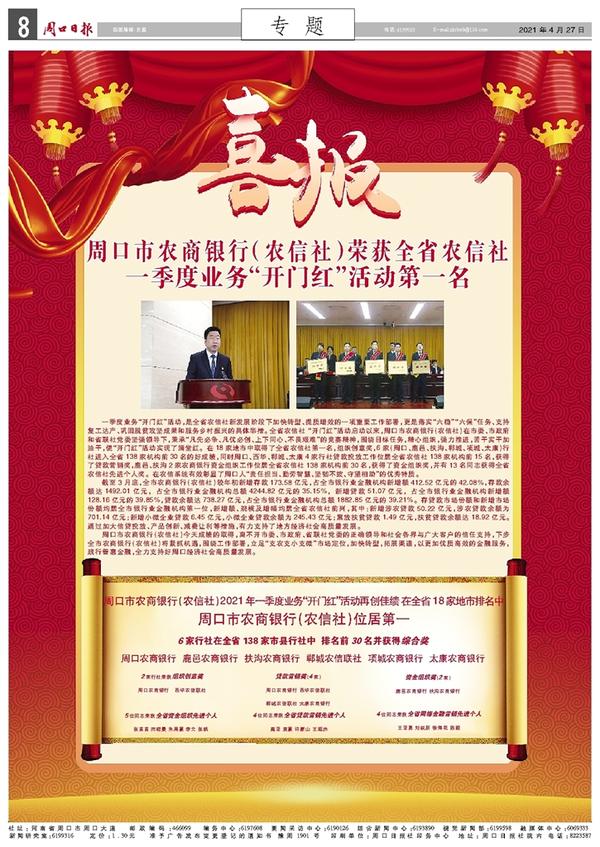 周口市农商银行(农信社)荣获全省农信社 一季度业务“开门红”活动第一名