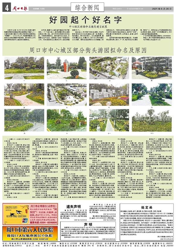 周口市中心城区部分街头游园拟命名及原因