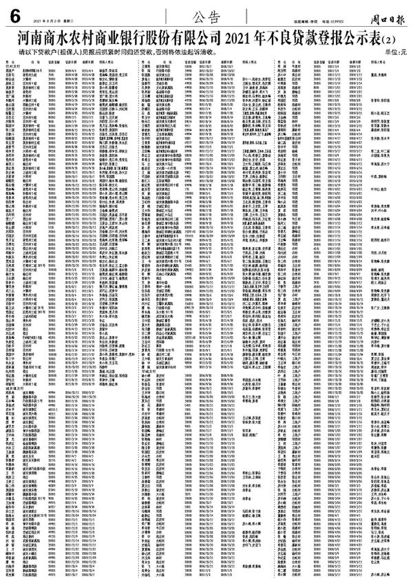 河南商水农村商业银行股份有限公司2021年不良贷款登报公示表(2)