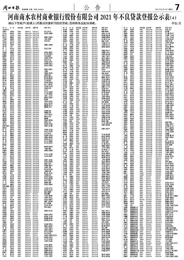 河南商水农村商业银行股份有限公司2021年不良贷款登报公示表(4)