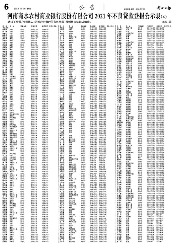 河南商水农村商业银行股份有限公司2021年不良贷款登报公示表(6)