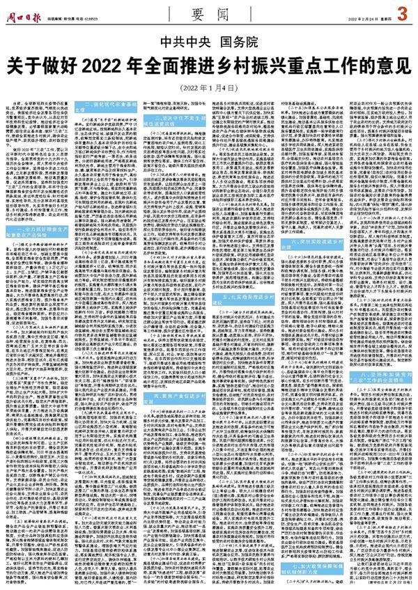 关于做好2022年全面推进乡村振兴重点工作的意见