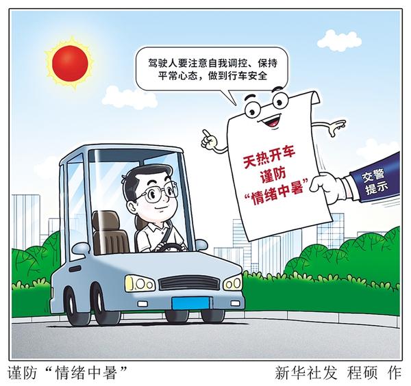 连日来,多地出现持续高温天气。当进入如蒸笼一般的驾驶室、手握滚烫的方向盘时,有驾驶人可能会出现“情绪中暑”,开车更容易“上头”。交警提醒,不良情绪会对行车驾驶带来诸多危害,驾驶人要注意自我调控、保持平常心态,做到行车安全。 新华社发 程硕 作