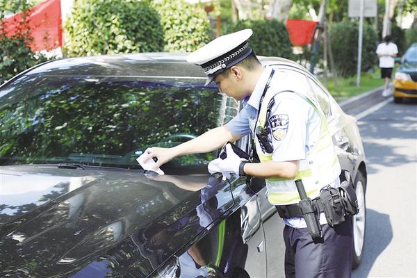 民警对违停车辆张贴违法停车告知单。