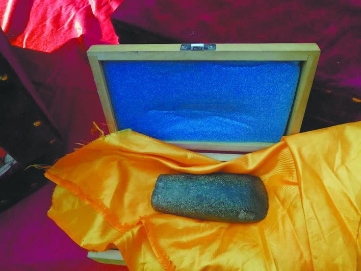 对这柄“开天斧”,赵长佰极其珍惜。即便是拿给记者看,他也是将“开天斧”藏在怀里抱着出来的。这柄“开天斧”装在一个精致的木匣子里,用金色的软布包裹着。小心翼翼地打开后,赵长佰才招呼大家上前。这是一块长约16厘米的石头,表面光滑,颜色呈青灰色,斧刃面呈圆弧形,看上去原始而质朴。