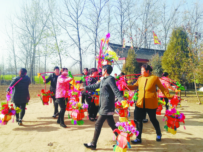 担经挑,源自上古的舞蹈。木岗寺的经挑队跳了好多年了,在家的妇女几乎都是队员。舞者挑着花篮边跳边唱,经歌多是盘古女娲开天辟地、抟土造人的故事。她们开始是自唱自跳,现在也有了现代气息,配上了音箱,可循环播放经歌伴奏。见有人拍照,队员们跳得更起劲儿,表情也更加丰富。一曲结束,大家原地休息,几个队员主动上前:“你们是记者吧,可得好好宣传宣传俺,俺这个经挑队可有名了,不光在俺村跳,还出过远门,去过淮阳哩。”“你问这经歌唱的啥啊,都是盘古老祖的事。盘古老祖开天辟地,是天下第一神,就是俺这儿的。”