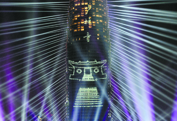 2018年1月1日凌晨,在郑州市郑东新区举行的跨年灯光秀上,光影投射出少林寺的图案,迎接新年。新华社记者 李安 摄