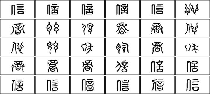 “信”,在六书中属会意字。甲骨文从人,从言;金文从人,从口。《说文》:“信,诚也。”故其本义为人之言语真意实,简言之“人言为信。”