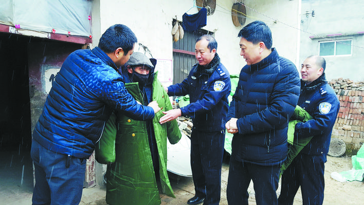 在获悉商水县谭庄镇三里桥村李月强夫妇因病致使家庭贫困后,1月3日上午,该县公安局民警冒雪为他们送来了两件御寒棉衣。