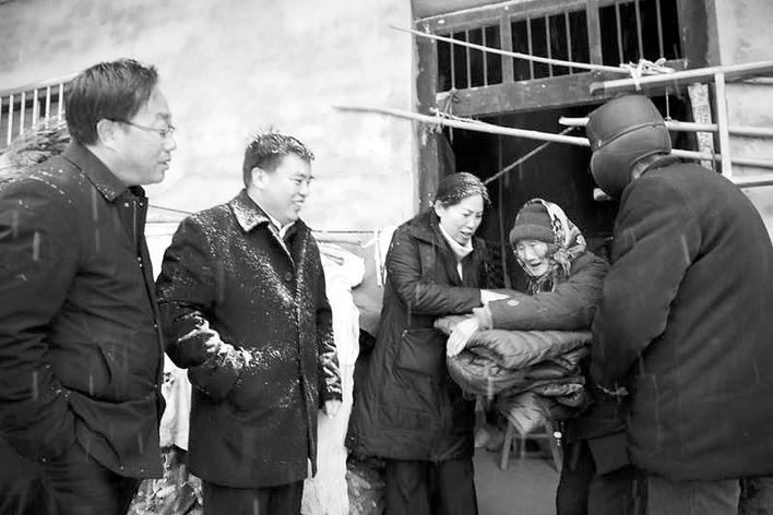 大雪天气,寒气逼人。商水县2000多名脱贫攻坚驻村队员和县乡干部,奔赴各乡镇、村贫困户家中送去棉衣棉被,到部分企业检查恶劣天气应急准备情况,送去党和政府的温暖,保障他们顺利过冬。图为1月3日商水县副县长韩秀娟(左三)到平店乡刘楼村为贫困户送去棉衣。