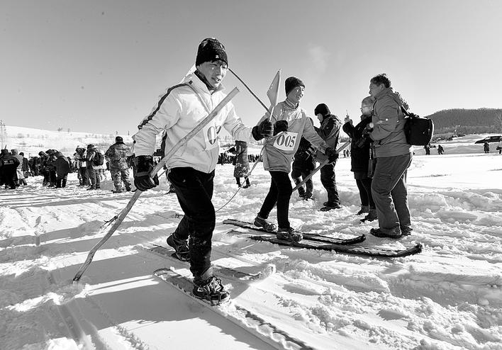近日,在新疆喀纳斯禾木村举办的泼雪节上,当地居民脚踩古老毛皮滑雪板,正在为游客展示原始狩猎比赛。