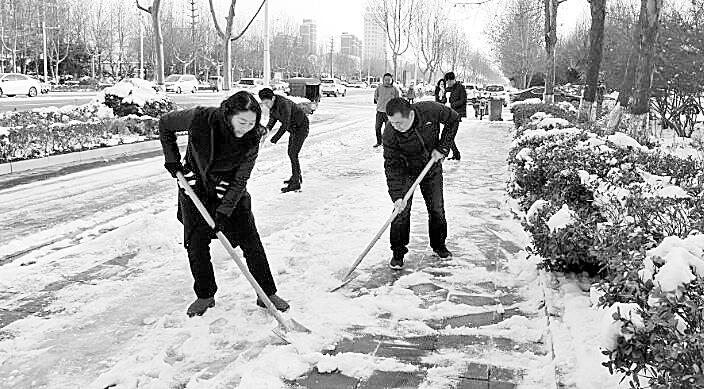 1月8日上午,周口市部分机关单位组织党员干部走上街头,清除人行道和慢车道上的冰雪,受到广大市民的称赞。