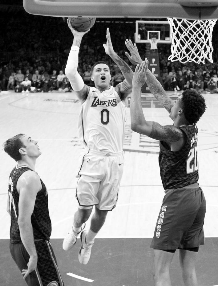 当日,湖人队球员库兹马(中)在比赛中投篮。