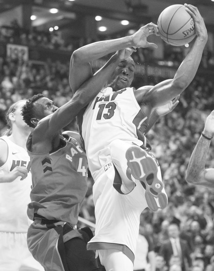 当日,热火队球员阿德巴约(右)与猛龙队球员西亚卡姆在比赛中争抢篮板球。