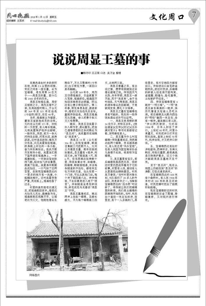 三、显王墓里有宝贝。前后堌堆现虽荡然无存,但附近村里仍然流传着关于它的故事。村里有人说,曾经有人从里面挖出铜铁器皿。村民吴万春说:“当时村里兴修水利,大队组织了20多人的专业队,我是其中之一。当修到宝堌堆西边的‘压水桥’时没砖了,领导就让我们挖堌堆里的砖用,我们是从堌堆的西南侧开始挖的。当时,先挖出个直径一米左右的井,往里走,有个一人多高的门。再往里走,有片空地四方都有出口。井和进出口由花砖垒砌而成。附近村民讲,后堌堆的砖被人拉走用于搭鸡窝、垒猪圈、砌墙头、垫宅基等,土也被铲平拉走。”